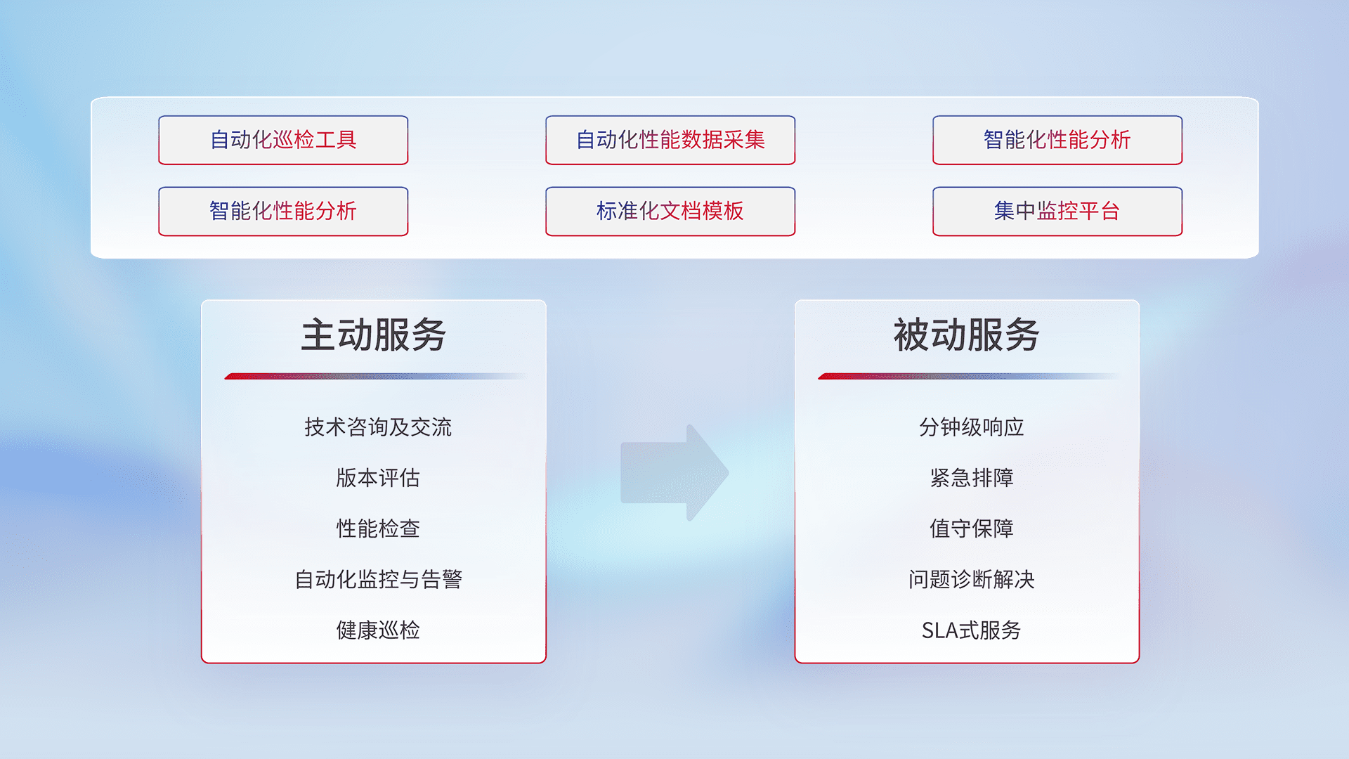 智能化工具和标准化文档,,保障服务质量,,,提供主动服务(包含技术咨询、、、版本评估、、性能检查、、、、自动化监控与告警、、健康巡检)和被动服务包含(分钟级响应、、、紧急排障、、、、值守保障、、问题诊断解决、、、、SLA服务)。。。